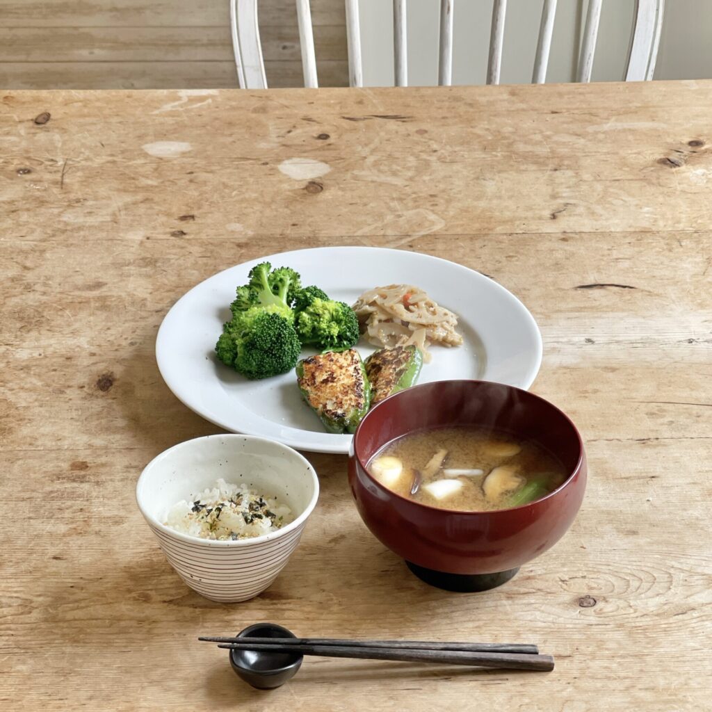 でも今日の昼ごはん用として冷凍庫の中からセレクトしたのは「夫特製・ピーマンの肉詰め」。それに昨日の夕ご飯の残り物の「レンコンのきんぴら」、蒸したブロッコリー、それに味噌汁というメニューにすることに。