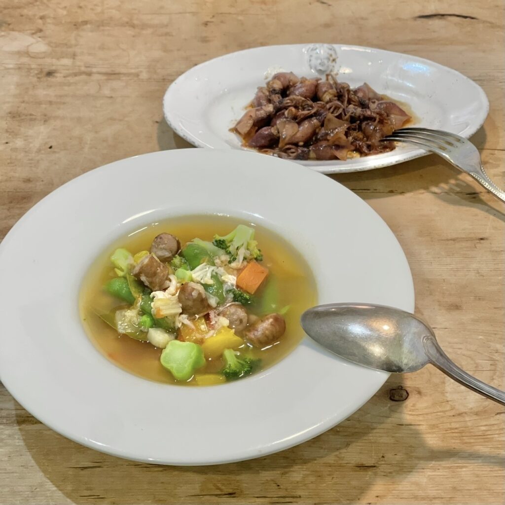 夕食は、やはり冷凍庫にストックしているミネストローネに野菜をプラス。そして今日、スーパーで買ってきたホタルイカのバター醤油炒めをたっぷりと。